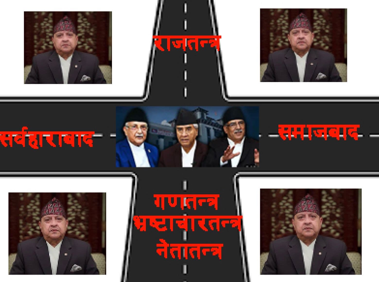 नेपालको राष्ट्रिय राजनीति फेरी परिवर्तनको चौबाटोमा पुगेको छ । बिभिन्न पार्टी र पेशागत संघसंगठनहरू समेत धमाधम आआफ्ना माग लिएर सडक आन्दोलनमा उत्रिन थालेका छन् । सरकारी कर्मचारीले समेत बर्तमान सरकारलाई असहयोगगर्नु गंभिर बिषय भएको छ । हालको अवस्थामा राजनीतिक परिवर्तनका मुख्यत तीनवटा बाटाहरू देखिएका छन् । एकथरी यथास्थितिवादीहरू बिद्यमान बुर्जुवा गणतन्त्र (पुष्पकमल दाहालका शब्दमा) को पक्षमा रहेका छन् भने अर्कोथरी संवैधानिक राजतन्त्रसहितको बहुदलीय संसदीय ब्यवस्थाको पक्षमा रहेका छन् । तेश्रोथरीले जनगणतन्त्रको कुरा उठाएका छन् । राजावादी र बुर्जुवा गणतन्त्रवादी बीचको रस्साकस्सी तेज भएपछि जनगणतन्त्रको नारा मत्थर भएको देखिएको छ । नेकां, एमाले र माओवादी केन्द्रलगायतका बिचौलिया पार्टीहरू जनगणतन्त्रको पक्षमा नरहेको स्पष्ट छ भने राजतन्त्रसहितको बुहदलीय संसदीय ब्यवस्था कि संघीयतासहितको गणतन्त्रभन्ने कुरामा उनीहरू द्विबिधामा रहेको देखिएको छ । विदेशी खासगरी भारतीय हस्तक्षेपबाट ०४६ सालको राजनीतिक परिवर्तन भएको थियो । तत्कालीन राजा वीरेन्द्र आफैले संवैधानिक राजतन्त्र सहितको बहुदलीय संसदीय ब्यवस्था स्थापना गरेका कारण राजावादीहरू त्यसलाई स्वीकार गर्न बाध्य छन् । ०४६ को राजनीतिक परिवर्तनपछि नेकां र एमाले सहितका संसदवादी दलहरूले ०४७ को संविधान घोषणा गरेका र त्यसलाई त्यतिबेला उत्कृष्ट संविधान समेत भनिएका कारण उनीहरू पुरानै अवस्थामा फर्कनसक्ने संभावना पनि छ । माओवादी केन्द्र र त्यसमा पनि सो पार्टीका अध्यक्ष पुष्पकमल दाहालले ०६२ मंसिर सात गते नेपालका सात संसदवादी दलहरूसँग १२ बुँदे सहमति गर्ने बहानामा भारतको नयाँ दिल्लीमा जनयुद्ध बिसर्जन गरेका कारण सो दल फेरी जनयुद्ध र जन गणतन्त्रमा जाने कुनै संभावना छैन । त्यसैगरी सो दलले बिद्यमान गणतन्त्रलाई पनि पूर्णरूपमा स्वीकार गर्न नसकिरहेको अवस्था छ । माओवादी केन्द्रका केही नेताहरूको प्रयास हालसम्म पनि देशमा एकपछि अर्को संकटको सिर्जना गरेर यसलाई संकटमा पु¥याउनेमै केन्द्रित रहेको देखिएको छ । दिल्लीमा भएको १२ बुँदे सहमतिमा देखिनेगरी नेपालमा राजतन्त्रको अन्त्य भनिएको थिएन भने बिभिन्न सामाजिक सुधारका कुराहरू अगाडि सारिएका थिए । तर भित्रीरूपमा नेपाललाई आर्थिक, सामाजिक र राजनीतिक रूपमा अस्तब्यस्त बनाउँदै बिघटनमा पु¥याएर दोश्रो सिक्किम बनाउने र नेपालमा कुनै हालतमा पनि कम्युनिष्ट शक्तिलाई अगाडि बढ्न नदिएर छिन्न भिन्न बनाउने संझौता गरिएको पछिल्ला कतिपय घटनाक्रमहरूले स्पष्ट गरेका छन् । ०६३ बैशाख ११ गते तत्कालीन राजा ज्ञानेन्द्र शाह र नेकां, एमाले र माओवादी सहितका आठ दलकाबीचमा भएको भ